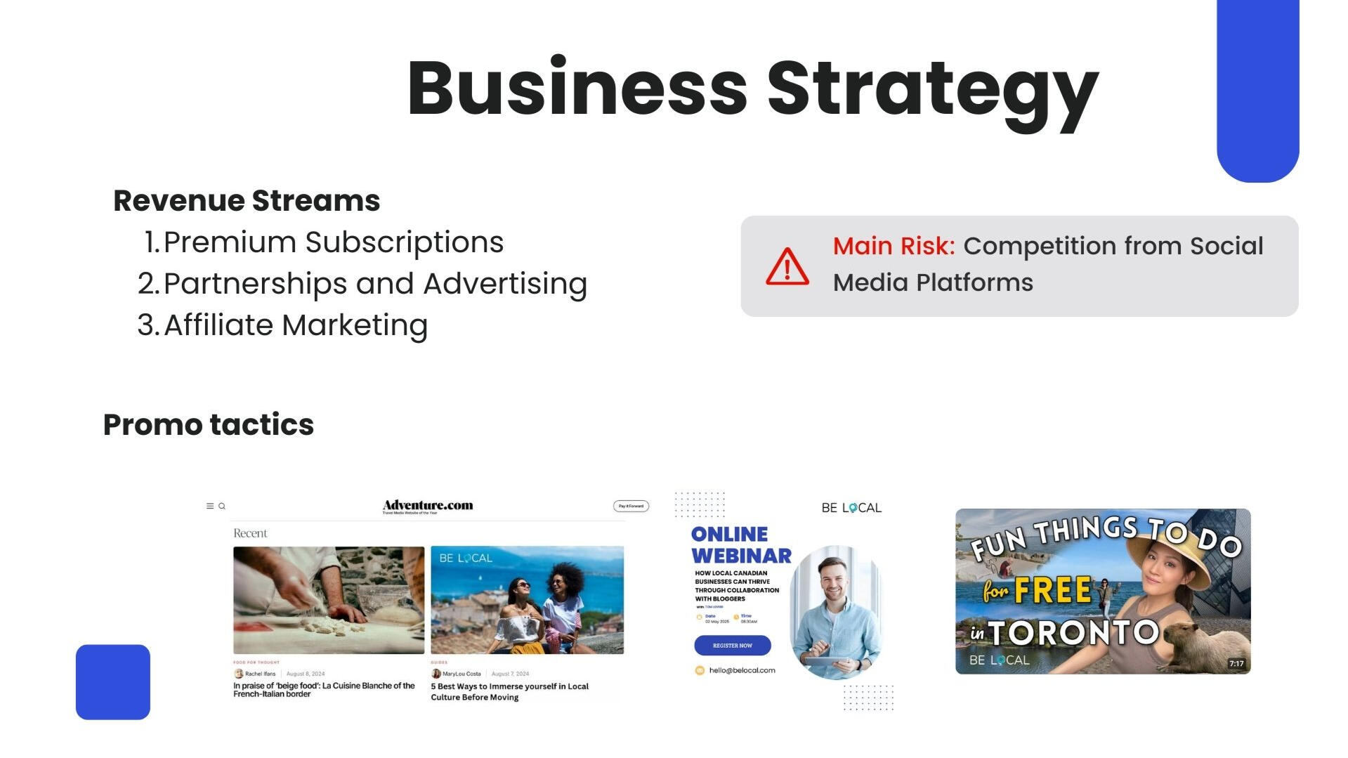 Promotional tactics for BeLocal focus on digital marketing strategies to effectively engage our target audience:• Influencer Collaborations: Partnering with local bloggers to leverage their audiences and enhance credibility.• Social Media Campaigns: Sharing engaging content on platforms like Instagram and YouTube to showcase local experiences and user stories.• Content Marketing: Creating a blog with articles on relocation tips and local culture to attract organic traffic.• Email Marketing: Building a subscriber list for targeted newsletters featuring updates and local insights.• Community Engagement: Hosting local events with bloggers and businesses to create buzz and encourage word-of-mouth referrals.