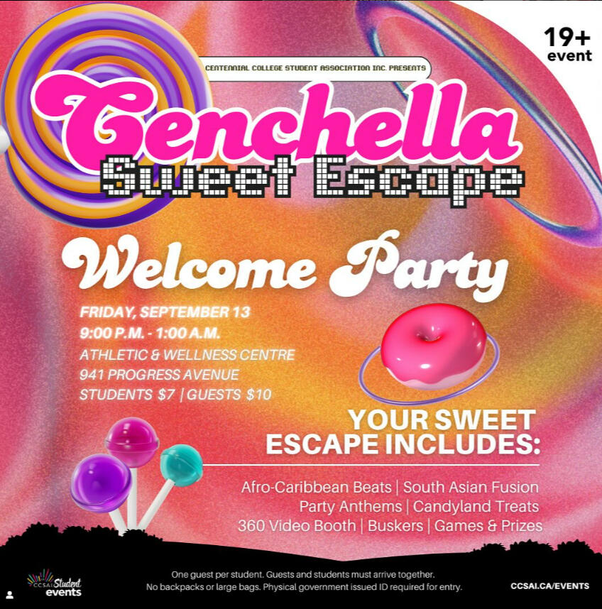 As a content creator for the Centennial College Student Association Inc. (CCSAI), I was tasked with developing and leading the implementation of a promotional strategy for the fall intake welcome party, "Cenchella: The Sweet Escape." This event aimed to celebrate all Centennial College students, both new and returning, while showcasing the vibrant student life at Centennial.